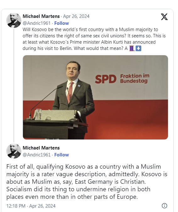 “A do të jetë Kosova vendi i parë në botë me shumicë myslimane që do t’u ofrojë qytetarëve të saj të drejtën e bashkimit civil të të njëjtës gjini? Kështu duket. Kështu së paku ka bërë të ditur kryeministri i Kosovës Albin Kurti gjatë vizitës së tij në Berlin. Çfarë do të thotë kjo…”, shkruan Martens.