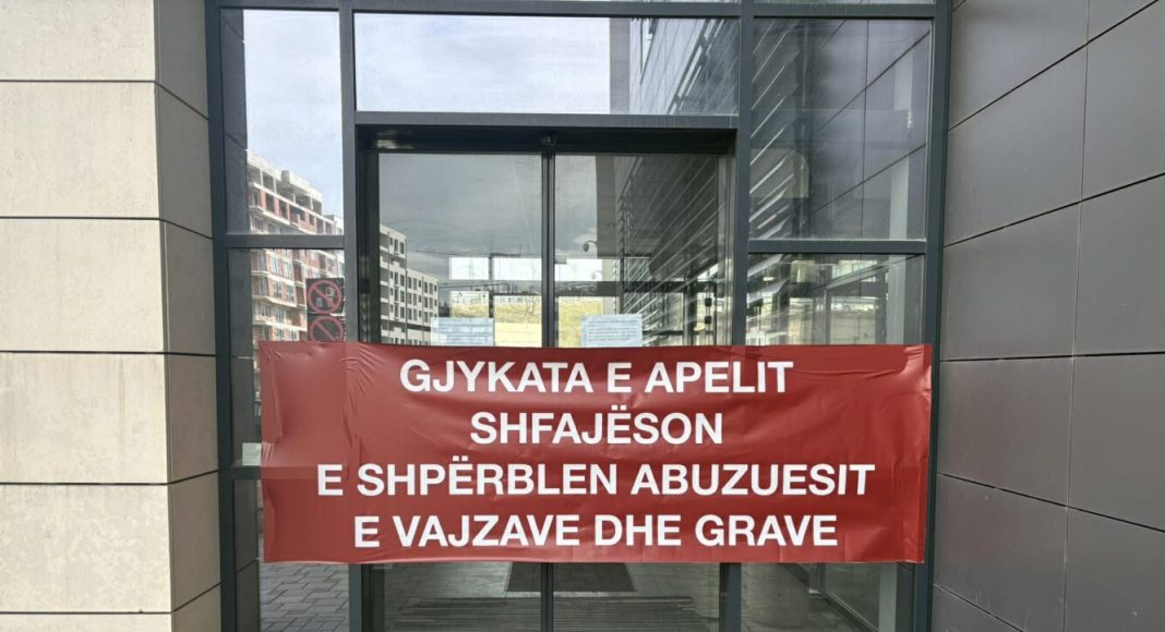 Gjersa në dyert e Gjykatës së Apelit kanë vendosur një pankarta me mbishkrim “Gjykata e Apelit shfajëson e shpërblen abuzuesit e vajzave dhe grave”