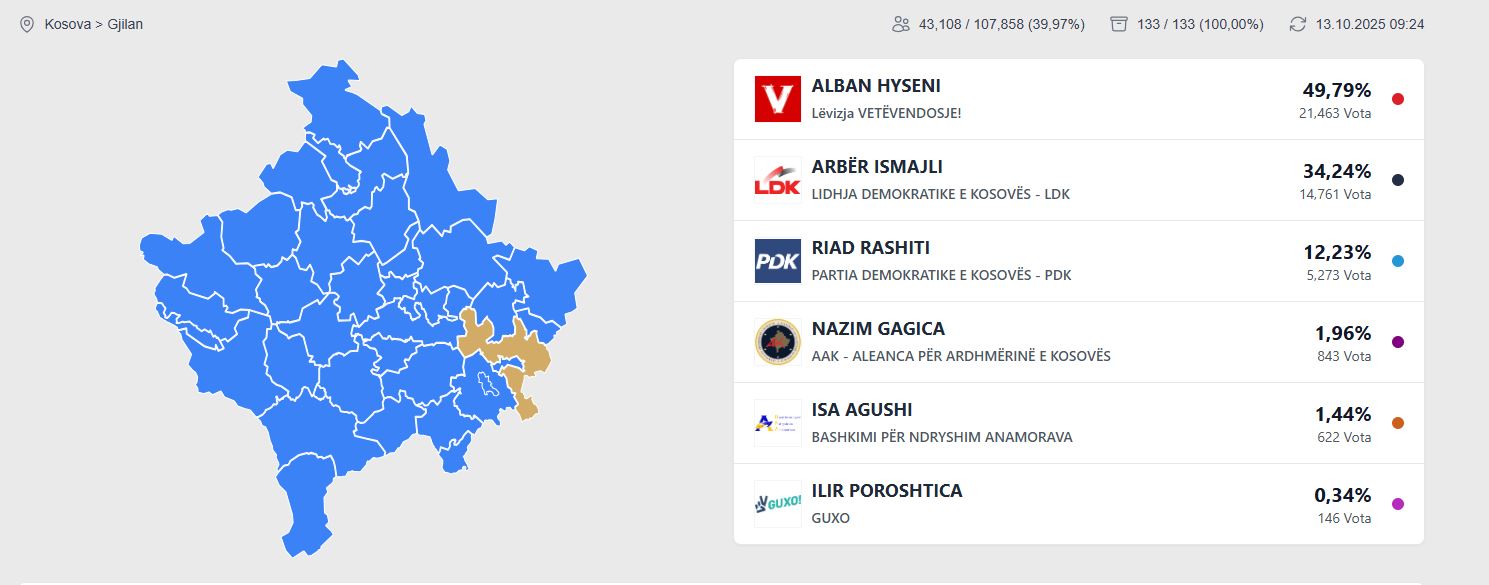 Bazuar në të dhënat e KQZ-së, në këtë komunë prin i pari Alban Hyseni i VV-së me 49.79%, derisa pas tij Arbër Ismajli i LDK-së me 34.24%, e që sipas këtyre rezultateve, VV e LDK shkojnë në balotazh për Gjilanin, transmeton Klankosova.tv.