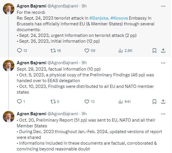 “Më 20 tetor, raporti preliminar (51 faqe) iu dërgua BE-së, NATO-s dhe të gjitha shteteve të tyre anëtare. Gjatë dhjetorit 2023 dhe gjatë periudhës janar-shkurt 2024, u ndanë versionet e përditësuara të raportit. Informacionet e përfshira në këto dokumente janë faktike, të vërtetuara dhe bindëse përtej dyshimit të arsyeshëm” shkroi ai në X.