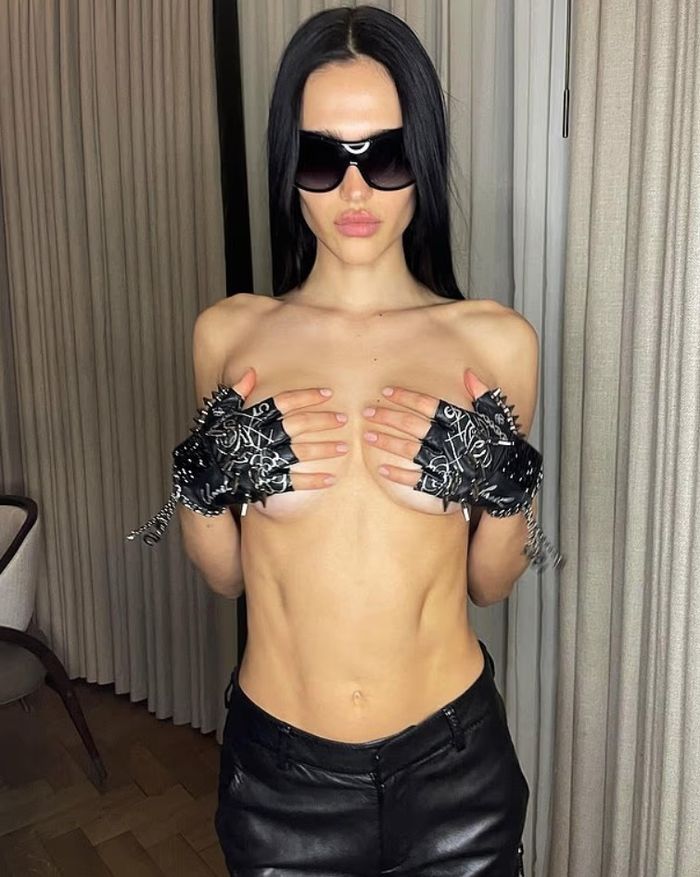 Në fotografi, 24-vjeçarja shfaqej me funde lëkure të zeza, syze dielli të mëdha dhe shprehje të fortë në fytyrë, duke goditur kamerën me pamjen e saj dramatike.