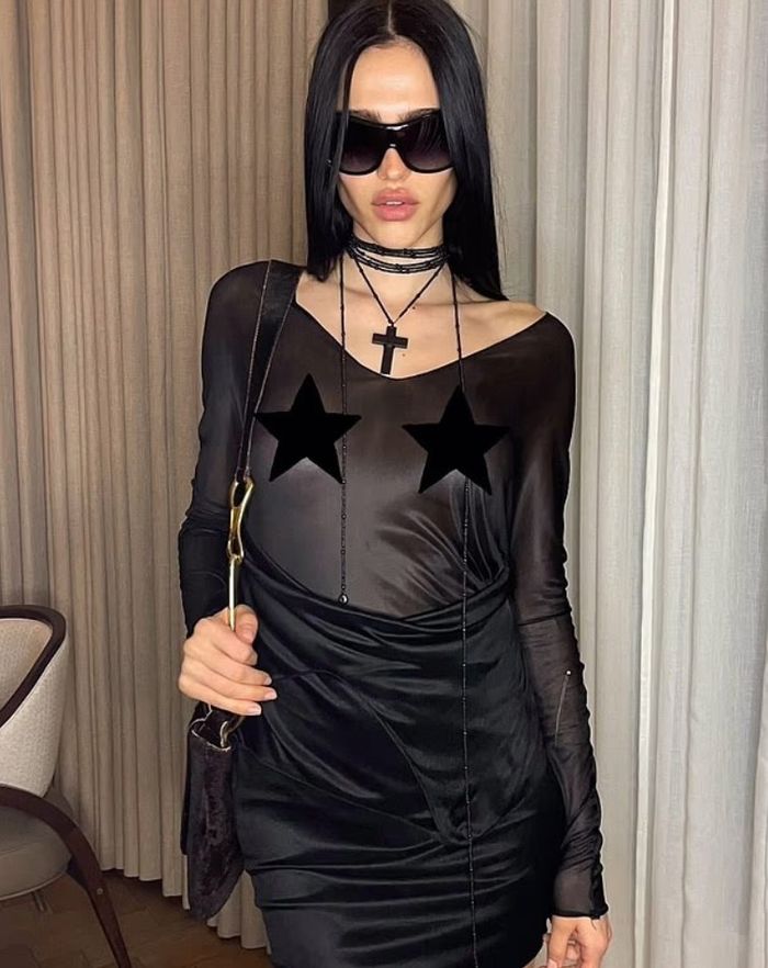Karuseli i fotografive përfshinte edhe veshje të tjera të guximshme, përfshirë një bluzë të zezë transparente me yje strategjikisht të vendosur, një fustan të hollë rozë dhe një bluzë dramatike që nxirrte në pah barkun e saj.