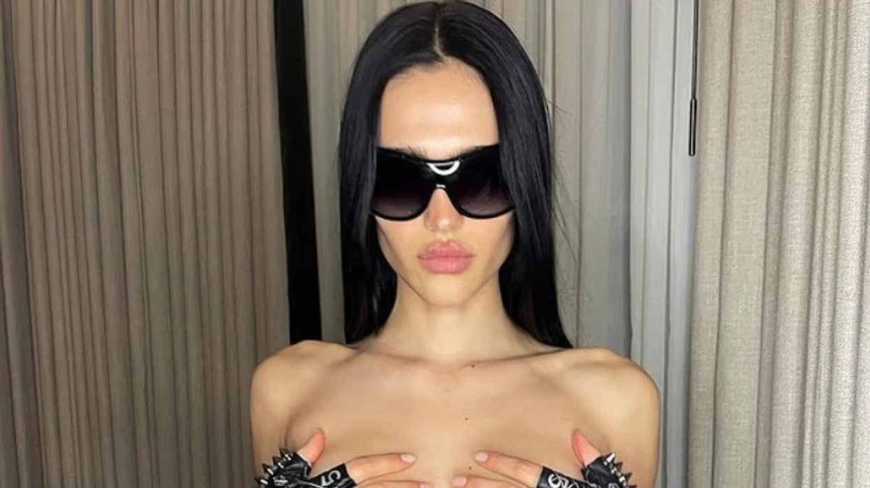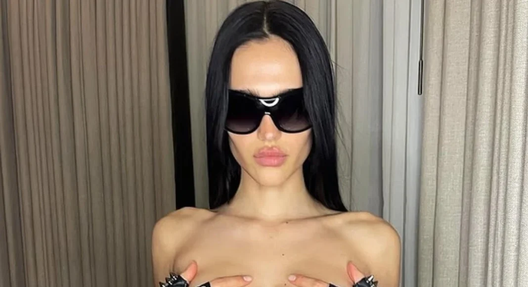 Në fotografi, 24-vjeçarja shfaqej me funde lëkure të zeza, syze dielli të mëdha dhe shprehje të fortë në fytyrë, duke goditur kamerën me pamjen e saj dramatike.