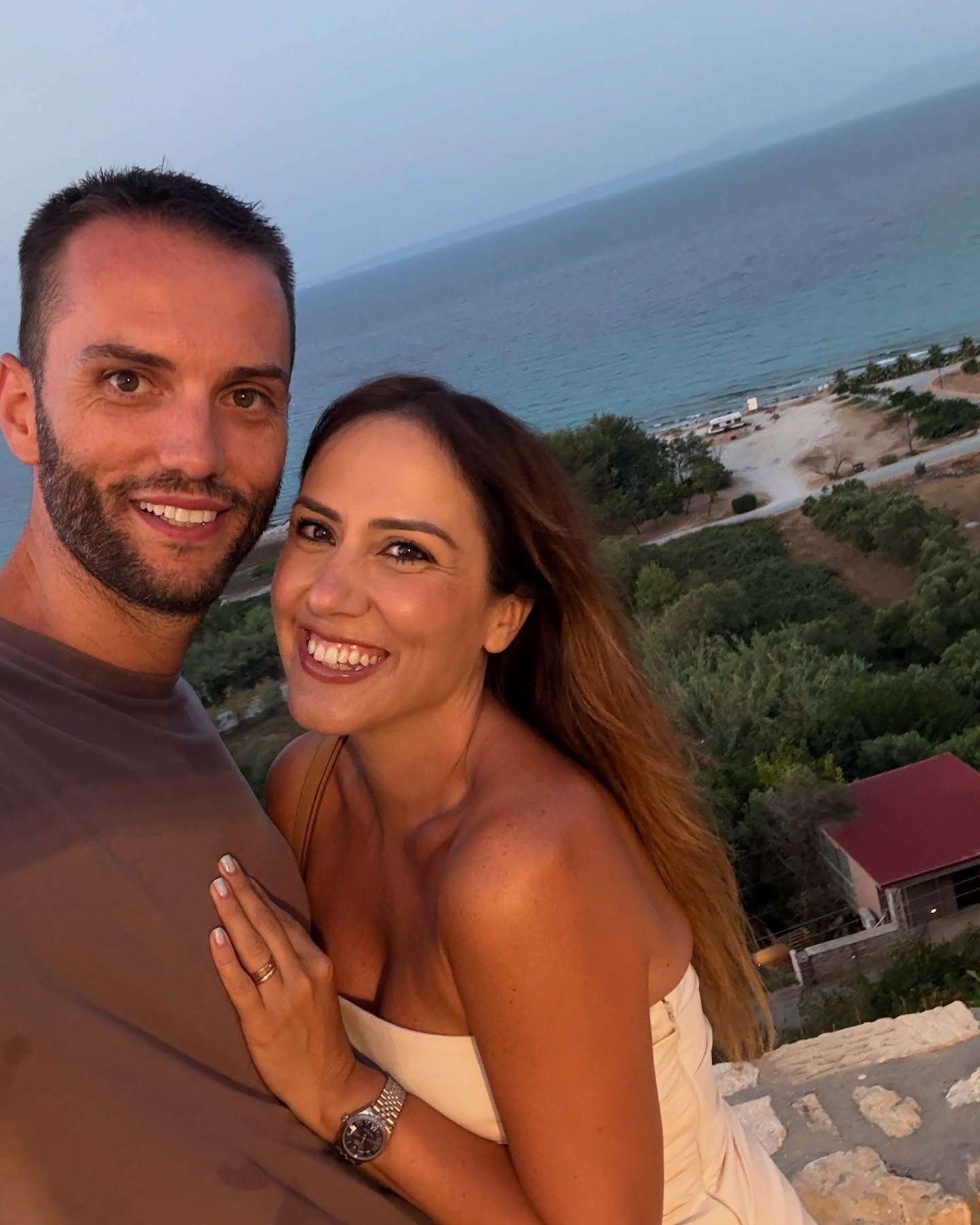 Në një tjetër imazh, Arbana dhe Eduardi shfaqen të vetëm, të lumtur dhe të buzëqeshur në një selfie romantike pranë bregut, me perëndimin që ndriçon lehtë sfondin.