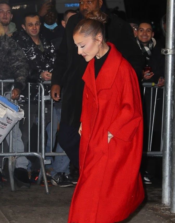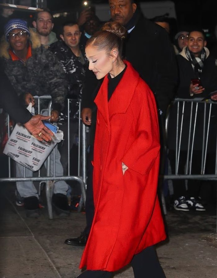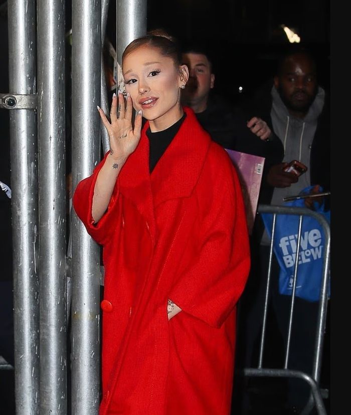 Ariana Grande u pa e veshur me një pallto të gjatë dhe të kuqe festive teksa shkonte në shfaqjen e filmit Wicked: For Good në New York të mërkurën.