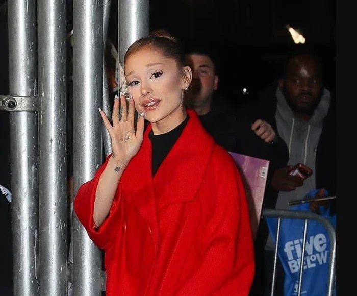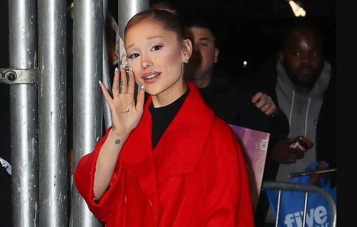 Ariana Grande u pa e veshur me një pallto të gjatë dhe të kuqe festive teksa shkonte në shfaqjen e filmit Wicked: For Good në New York të mërkurën.
