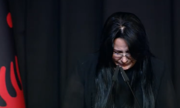 Xhoana Nano, bashkëshortja e ish-kryeministrit të Shqipërisë, Fatos Nano u ndal shpesh nga lotët gjatë fjalës lamtumirëse në ceremoninë mortore.