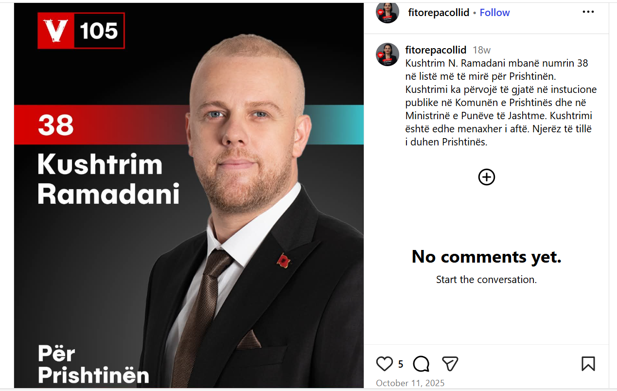 “Kushtrim N. Ramadani mbanë numrin 38 në listë më të mirë për Prishtinën. Kushtrimi ka përvojë të gjatë në instucione publike në Komunën e Prishtinës dhe në Ministrinë e Punëve të Jashtme. Kushtrimi është edhe menaxher i aftë. Njerëz të tillë i duhen Prishtinës;, kishte shkruar ajo.