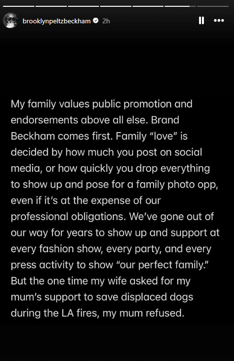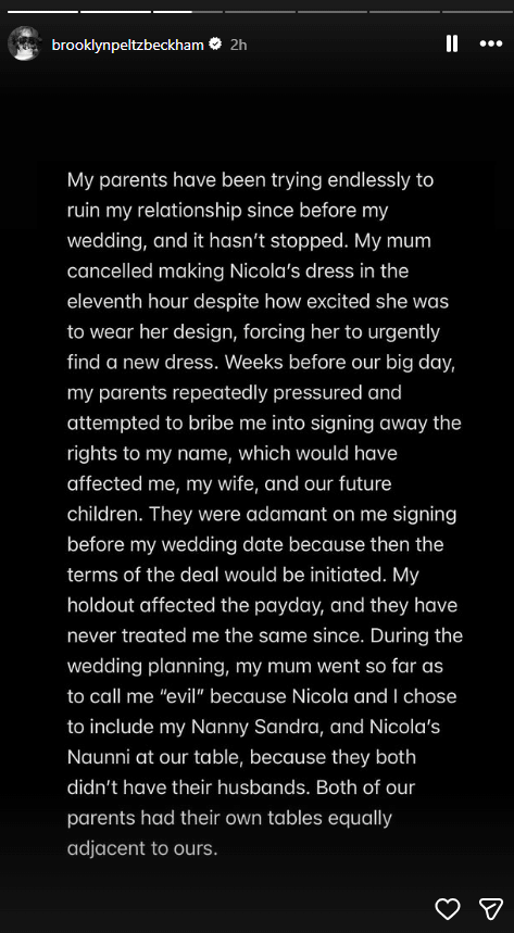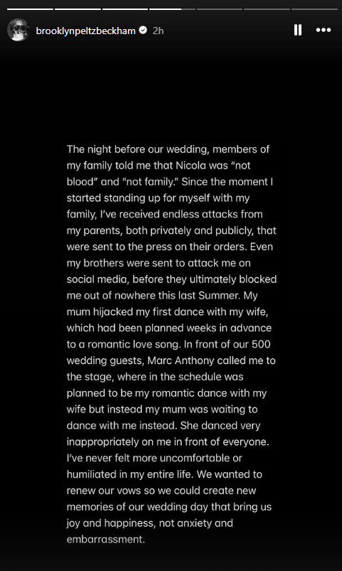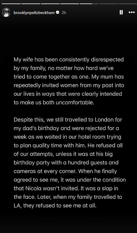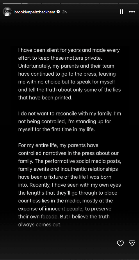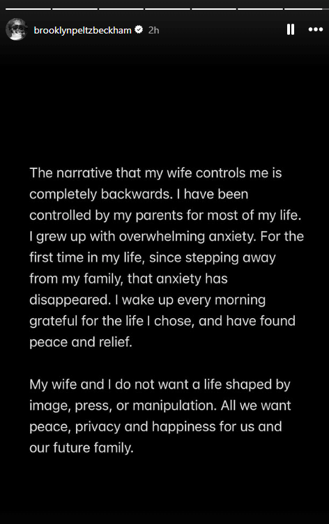 Në fund të deklaratës, Brooklyn kundërshton narrativën e përhapur se Nicola Peltz e kontrollon jetën e tij, duke e quajtur këtë pretendim “krejtësisht të rremë”.