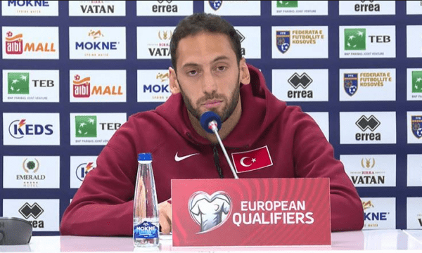 Aty, selektori i kombëtares turke, Vincenzo Montella dhe kapiteni turk, Hakan Çalhanoglu u paraqiten në konferencë për shtyp.