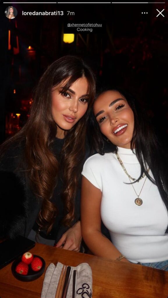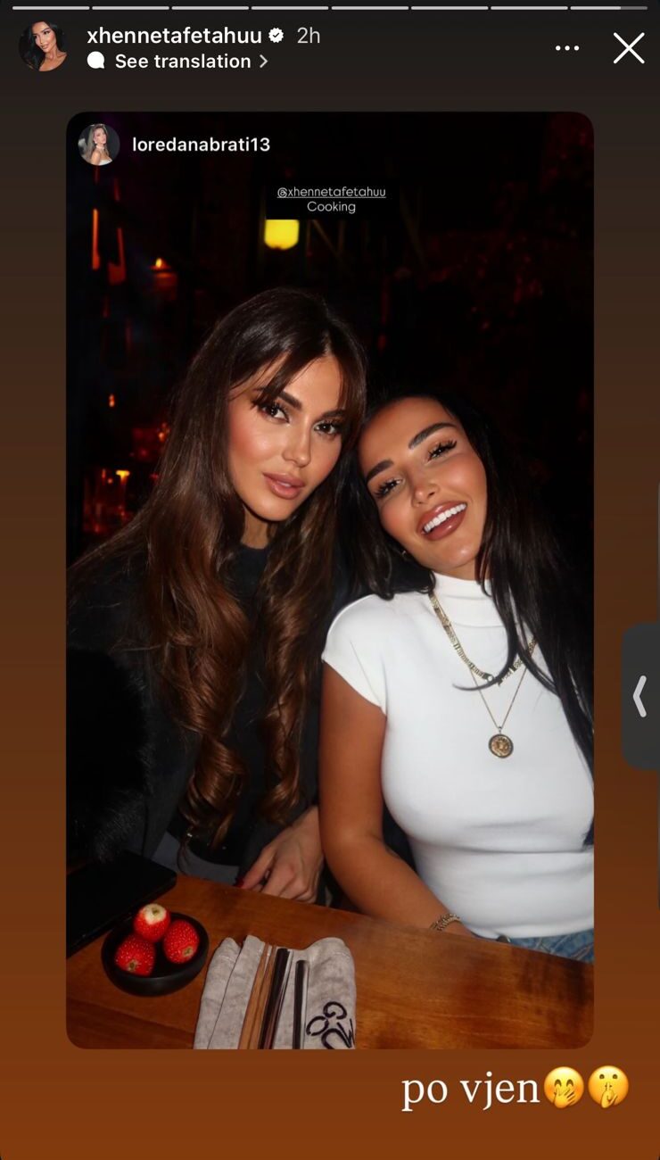 Në një foto të ngrohtë ku shfaqen të buzëqeshura, të veshura me shumë stil dhe duke shijuar një darkë miqësore, Loredana e ka etiketuar Xhenetën me mbishkrimin intrigues: “Cooking”, ndërsa Xheneta e ka shpërndarë foton me përshkrimin edhe më intrigues: “Po vjen”.
