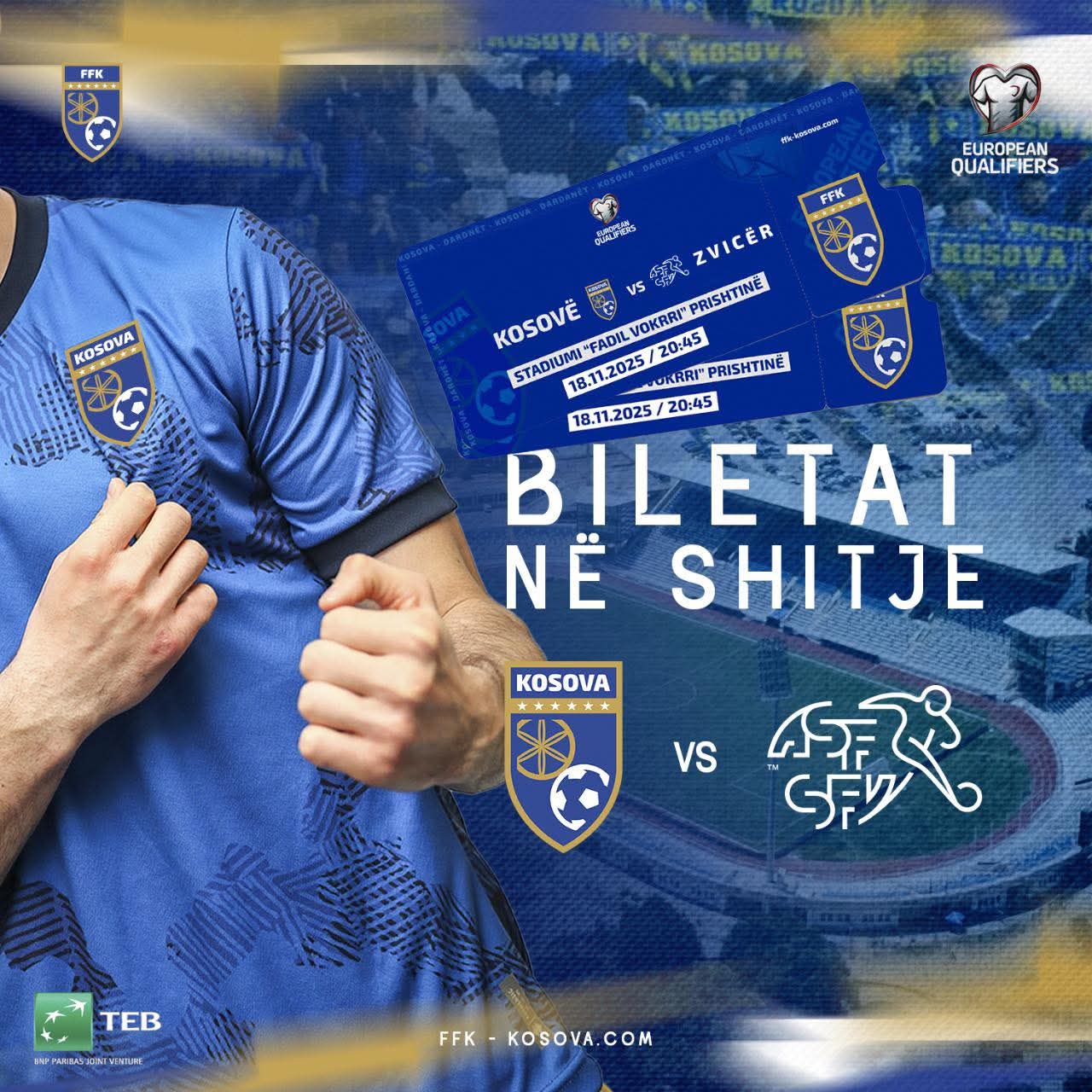 Federata e Futbollit të Kosovës ka nxjerr në shitje biletat e ndeshjes Kosovë – Zvicër, e vlefshme për kualifikueset e Kampionatit Botëror.