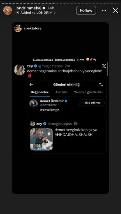 Ky çast bëri bujë në rrjete sociale e veçanërisht në X. Pikërisht për shkak të përmasave të mëdha që mori kjo video, Londrimi ka rënë në ‘radarin’ e aktores turke, e cila ka pëlqyer një postim të shpërndarë në X, transmeton Klankosova.tv.