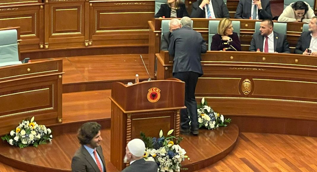 Deputetja Ganimete Musliu e vendos emblemën e UÇK-së në foltoren e Kuvendit