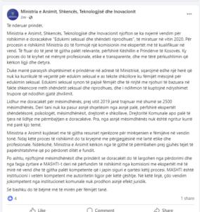 ”Ministria e Arsimit, Shkencës, Teknologjisë dhe Inovacionit njofton se ka nxjerrë vendim për rishikimin e doracakëve “Edukimi seksual dhe shëndeti riprodhues”, të miratuar në vitin 2020. Për procesin e rishikimit Ministria do të formojë një komisionin me ekspertët më të kualifikuar në vend. Të ftuar do të jenë të gjitha palët relevante, përfshirë Këshillin e Prindërve të Kosovës. Ky proces do të kryhet në mënyrë profesionale, etike e transparente, dhe me tërë përkushtimin që kërkon ligji dhe detyra.”, shkruan kjo ministri.