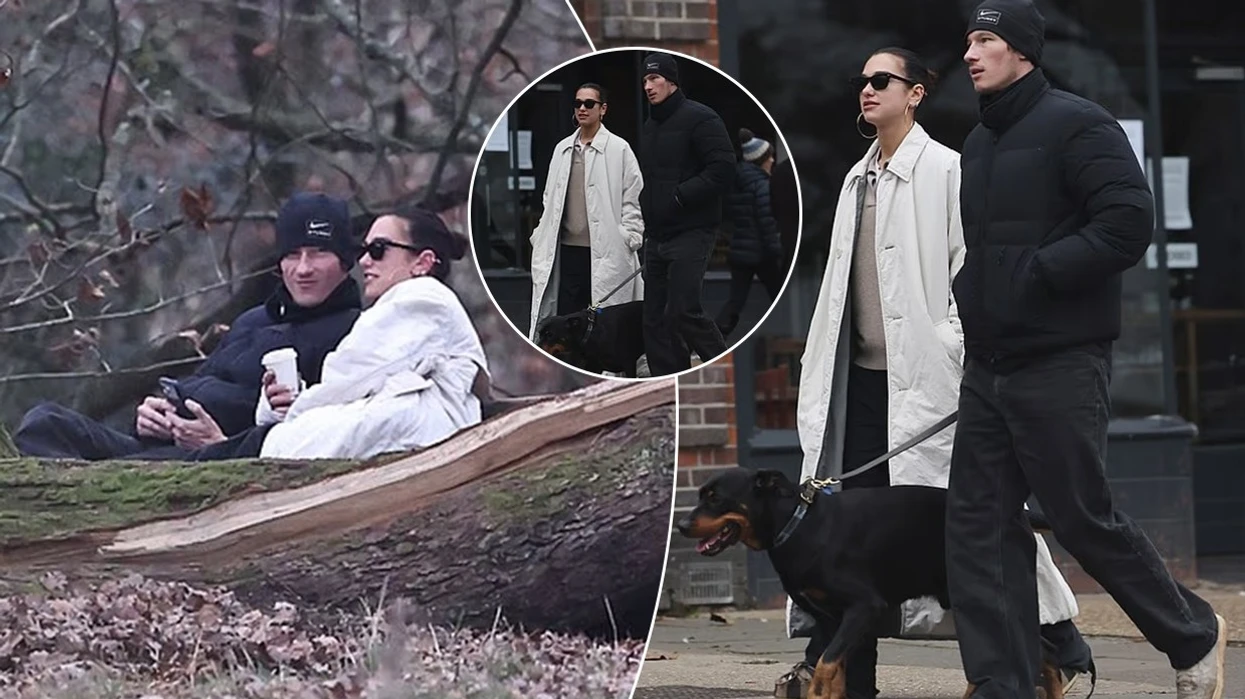 Dua u shfaq elegante si gjithmonë me një pallto trench ngjyrë krem dhe syze dielli, ndërsa Callum ishte veshur trashë me një xhaketë të zezë dhe kapele.