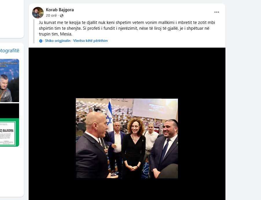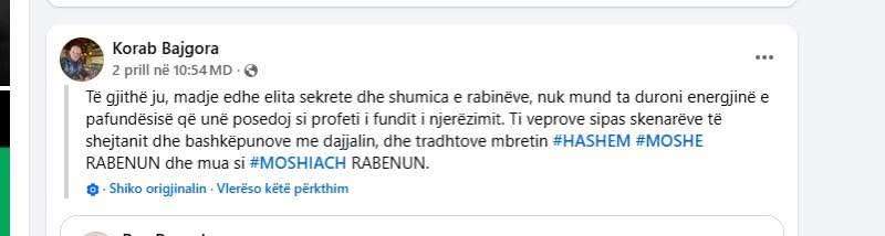 “Mbreti i madh #HASHEM është ARGUMENTI im. Me një argument të bazuar në parajsë kur jeta ime fizike është në rrezik #TORAH është TESTAMENTI im. Prej qe MOSHE RABENU me shkrujti si profeti i fundit i njerzimit, komandantat e kosoves ne krye me Ramush Hardinaj, qe eshte dajallar kane perdor institucionet shtetrore per me vra jashte ne liri dhe brenda burgut, por ne vitin 2019, kur me erdhi profecia, i thash MUHAMET HALITITIT, psikologu i cili tash i tha XHAVIT HALITIT se KADRI VESLIT tregoi se komuniteti hebre në KOSOVË i ka gjetur gjurmët e mia, më ka lëshuar por hebrenjtë u munduan të manipulojnë në mënyrë psiqike që ta marrin pasardhësin tim dhe ta sjellin në IZRAEL për ta mashtruar popullin hebre se MESIA ka lindur në IZRAEL. me respekt rabini i madh #MOSHIACH RABENU #INFINITY nga KOSOVA”, ka shkruan ai.
