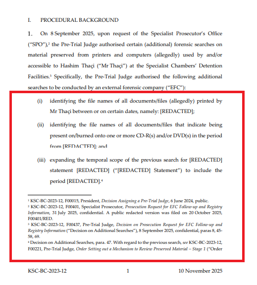 “Më 8 shtator 2025, me kërkesë të Zyrës së Prokurorit të Specializuar (“ZPS”), Gjykatësi i Procedurës Paraprake autorizoi disa kontrolle (shtesë) forenzike mbi materialet e ruajtura nga printerët dhe kompjuterët që (pretendohet se) janë përdorur nga dhe/ose kanë qenë të qasshme për Hashim Thaçin (“z. Thaçi”) në Qendrat e Paraburgimit të Dhomave të Specializuara. Specifikisht, Gjykatësi i Procedurës Paraprake autorizoi kryerjen e kontrolleve të mëtejshme nga një kompani e jashtme forenzike (“KJF”)”, citohet në një shkresë, të nxjerrur nga gjyqtarja e procedurës paraprake, Marjorie Masselot në rastin ku Thaçi akuzohet për ndërhyrje në drejtësi.
