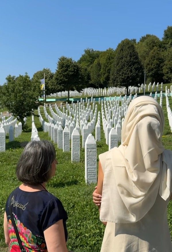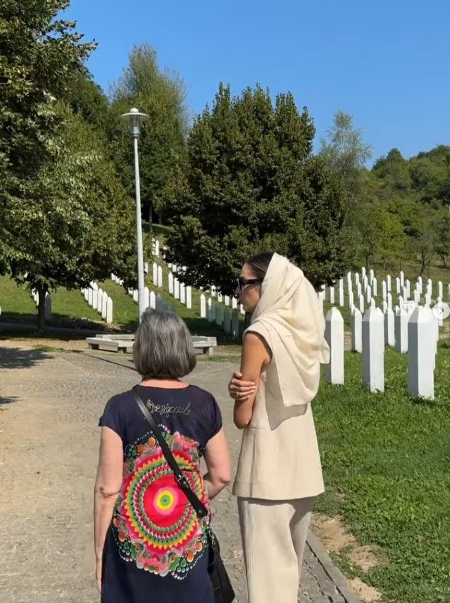 Në llogarinë e saj në Instagram, Emina ka ndarë disa fotografi ku shihet e mbuluar me shami, ndërsa ecën mes varreve të të vrarëve. Pamjet, të ngarkuara me emocion, shoqëroheshin me një mesazh të fuqishëm reflektimi dhe kujtese.