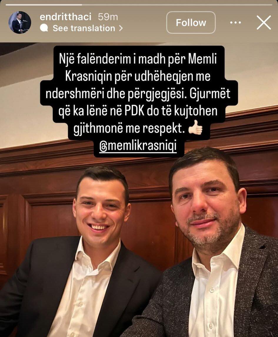 “Një falënderim i madh për Memli Krasniqin për udhëheqjen me ndershmëri dhe përgjegjësi. Gjurmët që ka lënë në PDK do të kujtohen gjithmonë me respekt”, ka shkruar ai.