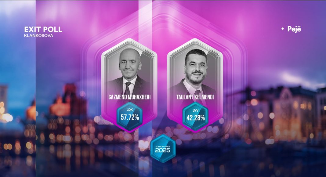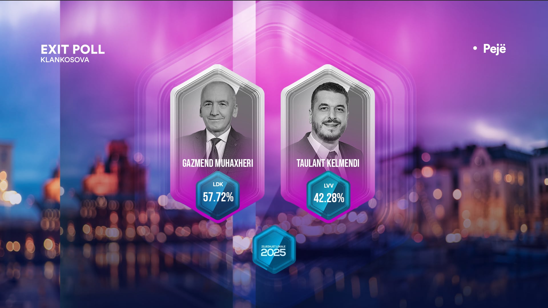 BallinaLajme Lajme Exit Poll-i i Klanit për Pejën e nxjerr Muhaxherin fitues me mbi 57% 19:15 | 09/11/2025 FacebookWhatsAppViber By GAZETA SCANNER 0 73 - Advertisement - Klan Kosova ka publikuar ekskluzivisht Exit Poll-in për balotazhin në Pejë, ku kokë më kokë ishin Gazmend Muhaxheri i LDK-së me Taulant Kelmendin e VV-së. Të ngjashme Kurti thotë se po niset për festë në Fushë Kosovë, Obiliq... 21:24 | 09/11/2025 Në Klinë fiton edhe për një mandat Zenun Elezaj 21:23 | 09/11/2025 Halil Thaçi, kryetar i Obiliqit 21:21 | 09/11/2025 Arben Gashi: LDK fiton në Viti, Prishtinë, Pejë, Junik e Dragash 21:08 | 09/11/2025 Rama: Sonte është festa e qytetit tonë, e shpresës, unitetit dhe... 21:03 | 09/11/2025 Alban Hyseni fiton sërish në Gjilan 20:52 | 09/11/2025 Më shumë Artikulli paraprakPrizrenin e rimerr Shaqir Totaj, ky është rezultati i Exit Poll-itArtikulli tjetërKëto janë rezultatet në Gjilan, Alban Hyseni merr mbi 58 për qind GAZETA SCANNER Të fundit Lajme Kurti thotë se po niset për festë në Fushë Kosovë, Obiliq e Mitrovicë të Jugut Lajme Në Klinë fiton edhe për një mandat Zenun Elezaj Lajme Halil Thaçi, kryetar i Obiliqit Lajme Arben Gashi: LDK fiton në Viti, Prishtinë, Pejë, Junik e Dragash Lajme Rama: Sonte është festa e qytetit tonë, e shpresës, unitetit dhe demokracisë Lajme Alban Hyseni fiton sërish në Gjilan Më shumë