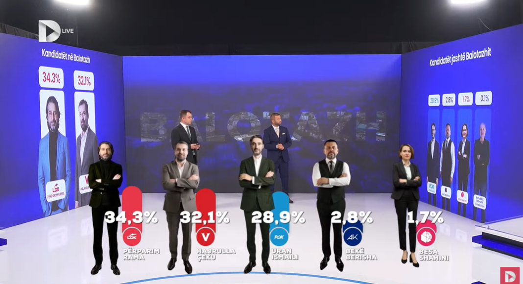 Sipas rezultateve të publikuara nga Exit Poll-i, Përparim Rama ka marrë 34.3 për qind të votave, ndërsa Hajrullah Çeku renditet shumë afër me 32.1 për qind. Në vendin e tretë qëndron kandidati i Partisë Demokratike të Kosovës (PDK) me 28.9 për qind, ndërsa Bekë Berisha nga Aleanca për Ardhmërinë e Kosovës (AAK) ka fituar 2.8 për qind dhe Besa Shahini nga Partia Socialdemokrate (PSD) 1.7 për qind.