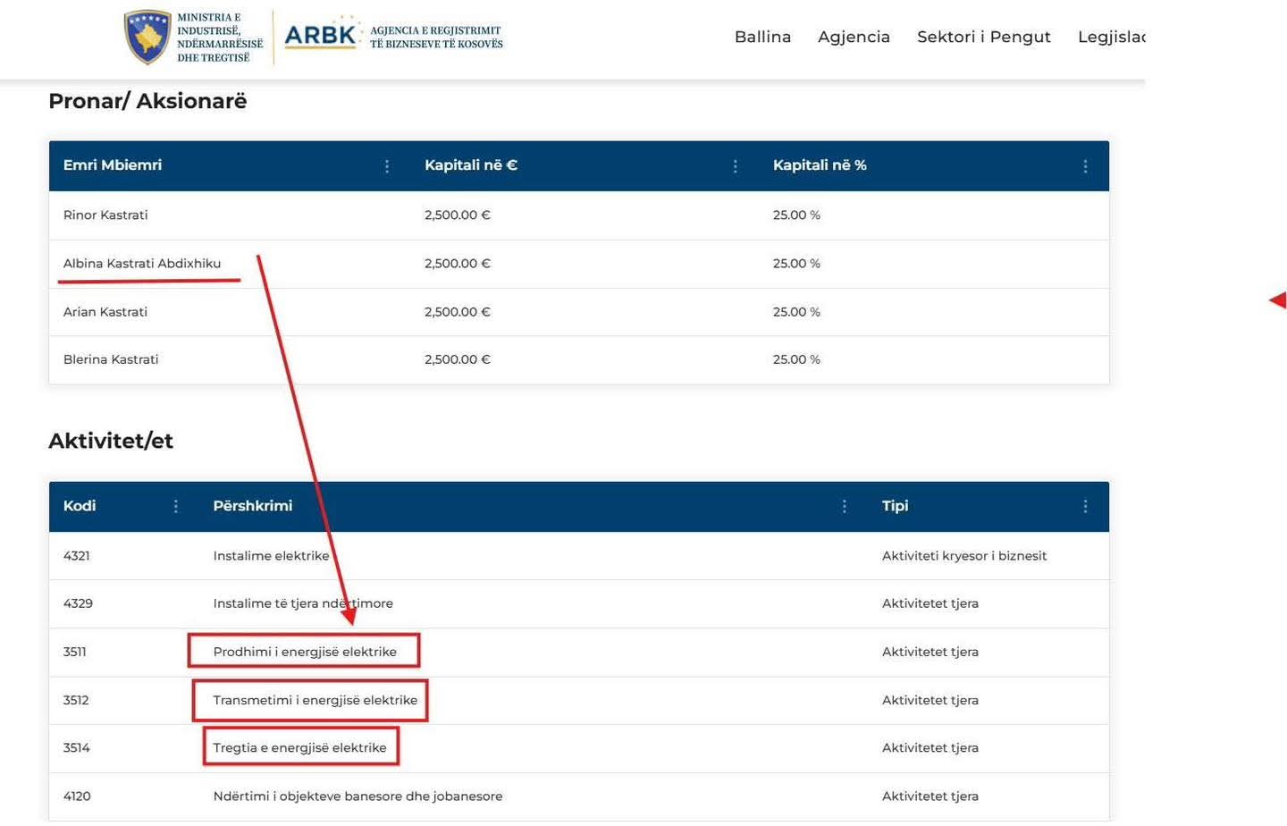 Në të dhënat zyrtare rezulton se Albina Kastrati-Abdixhiku zotëron 25 për qind të aksioneve në këtë kompani.