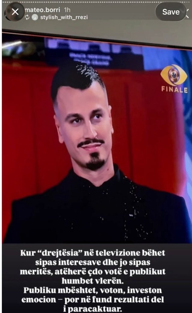 “Kur drejtësia në televizione bëhet sipas interesave dhe jo sipas meritës, atëherë çdo votë e publikut humbet vlerën. Publiku mbështet, voton, investon emocion, por në fund rezultati del i paracaktuar”, shkroi Mateo në Instastory.
