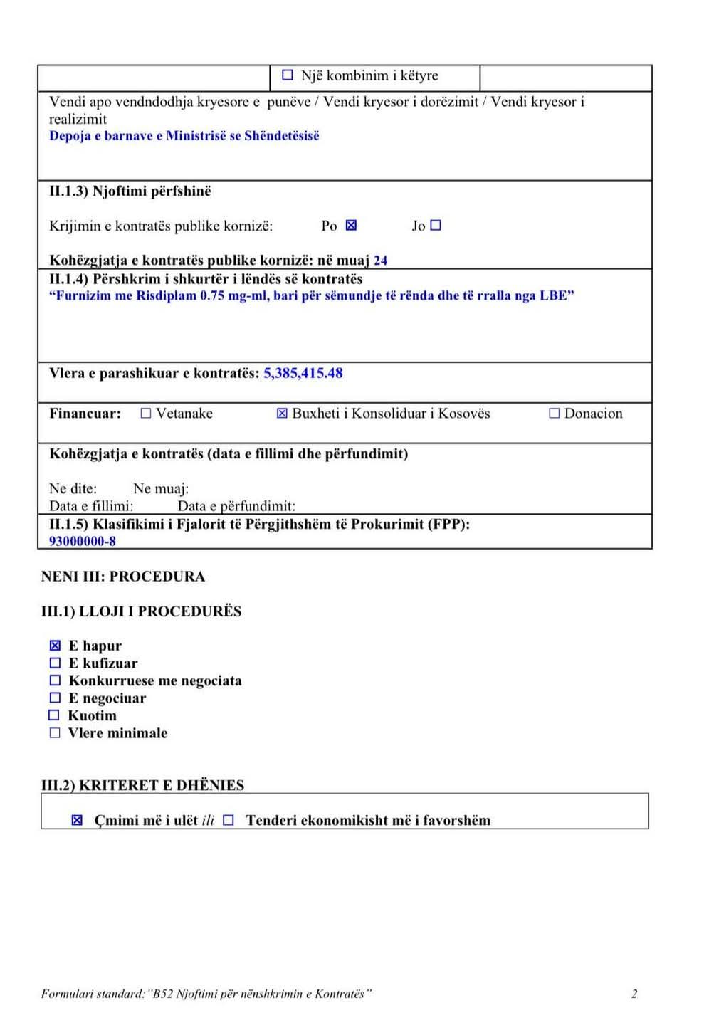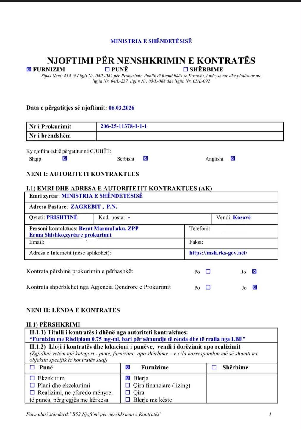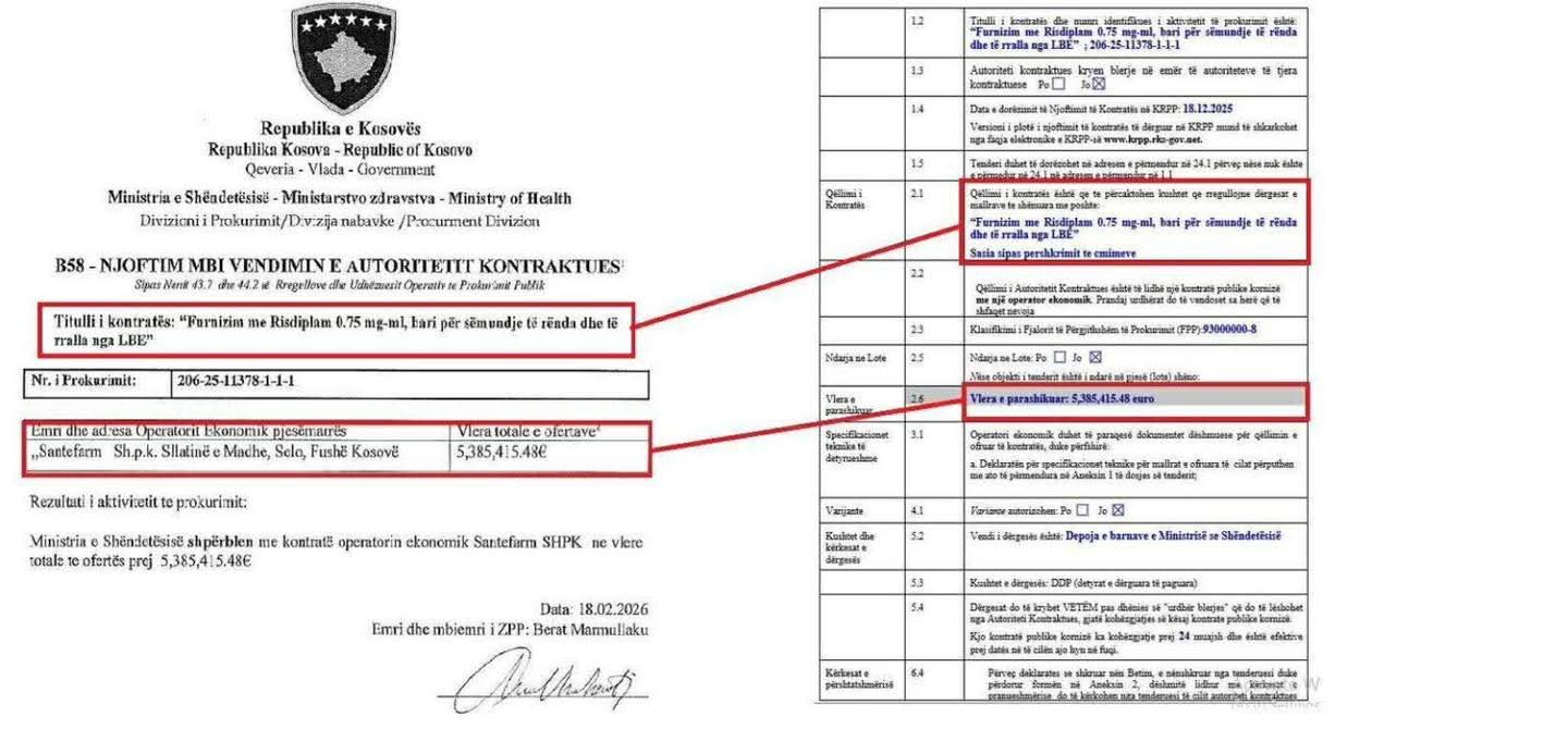Vendimi për dhënien e kontratës është nënshkruar më 18 shkurt 2026 nga zyrtari përgjegjës i prokurimit në Ministrinë e Shëndetësisë.
