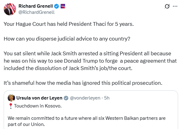 ”Gjyqi juaj i Hagës ka mbajtur Presidentin Thaçi për 5 vjet. Si mund të shpërndahen këshilla gjyqësore në çdo vend? Keni qëndruar në heshtje ndërkohë që Jack Smith arrestoi një president në detyrë, vetëm sepse ai po shkonte për të takuar Donald Trumpin për të formuluar një marrëveshje paqeje që përfshinte shpërbërjen e punës së Jack Smith-it / gjykatës. Është turp si media e ka injoruar këtë ndjekje politike”, shkruan Grenell në X.