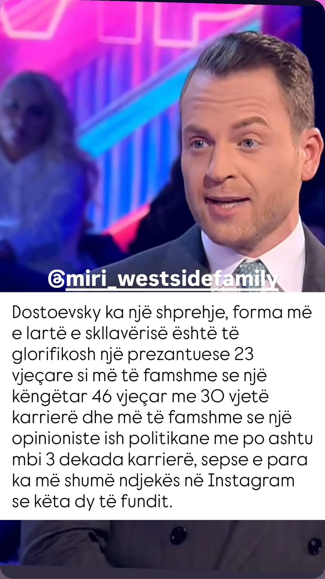 Përmes një postimi në InstaStory, Rabea kritikoi hierarkinë e formatit duke u shprehur: “Forma më e lartë e skllavërisë është të glorifikosh një prezantuese 23 vjeçare si më të famshme se një këngëtar me 30 vjet karrierë dhe një opinioniste ish-politikane me 3 dekada karrierë, vetëm prej ndjekësve në Instagram”.