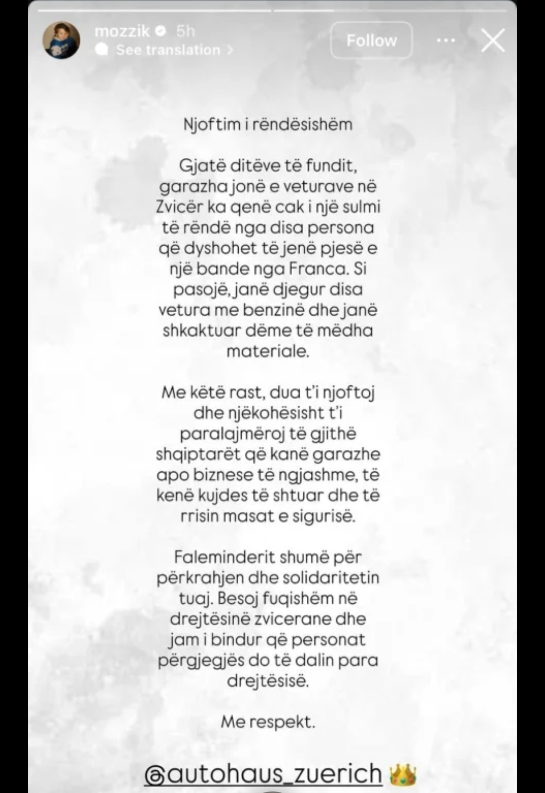 Reperi Mozzik ka bërë të ditur se biznesi i tij ka qenë cak i një sulmi, për të cilin thotë se është kryer nga një grup personash që i ka cilësuar si “bandë nga Franca”.