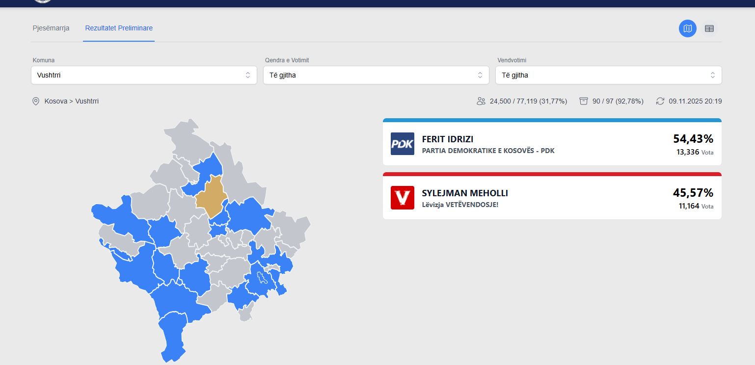 Ferit Idrizi i Partisë Demokratike të Kosovës është duke prirë me 54,43 për qind të votave në qytetin e Vushtrrisë, apo 13 mijë e 336 vota.