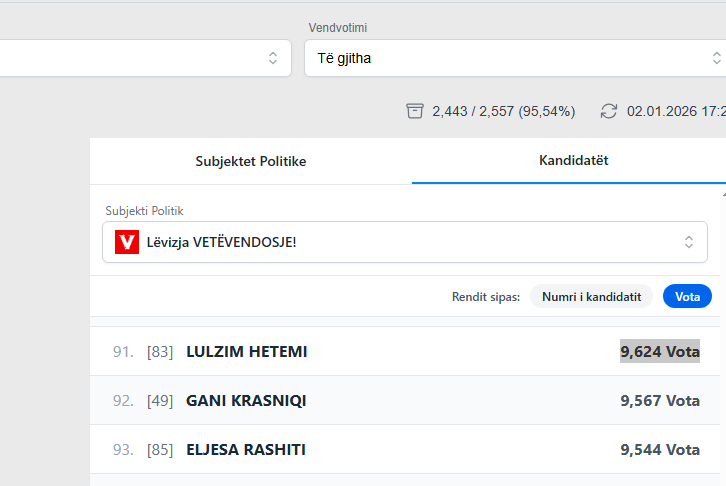 Lulzim Hetemi nga mbi 95 % të votave të numëruara, renditet i 91-ti me vetëm 9 mijë e 624 vota.
