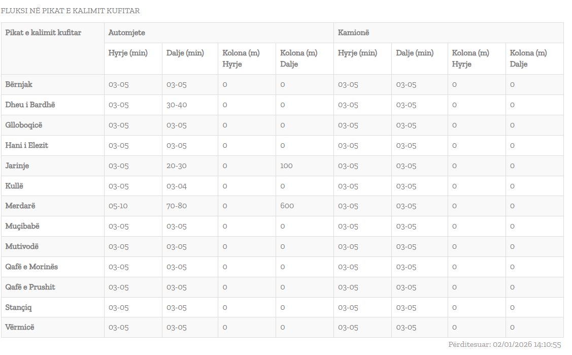Bazuar në të dhënat e Qendrës Kombëtare për Menaxhim Kufitar, në Merdarë po pritet deri në 80 minuta për të dalë nga vendi, derisa gjysmë ore po pritet më Jarinje.