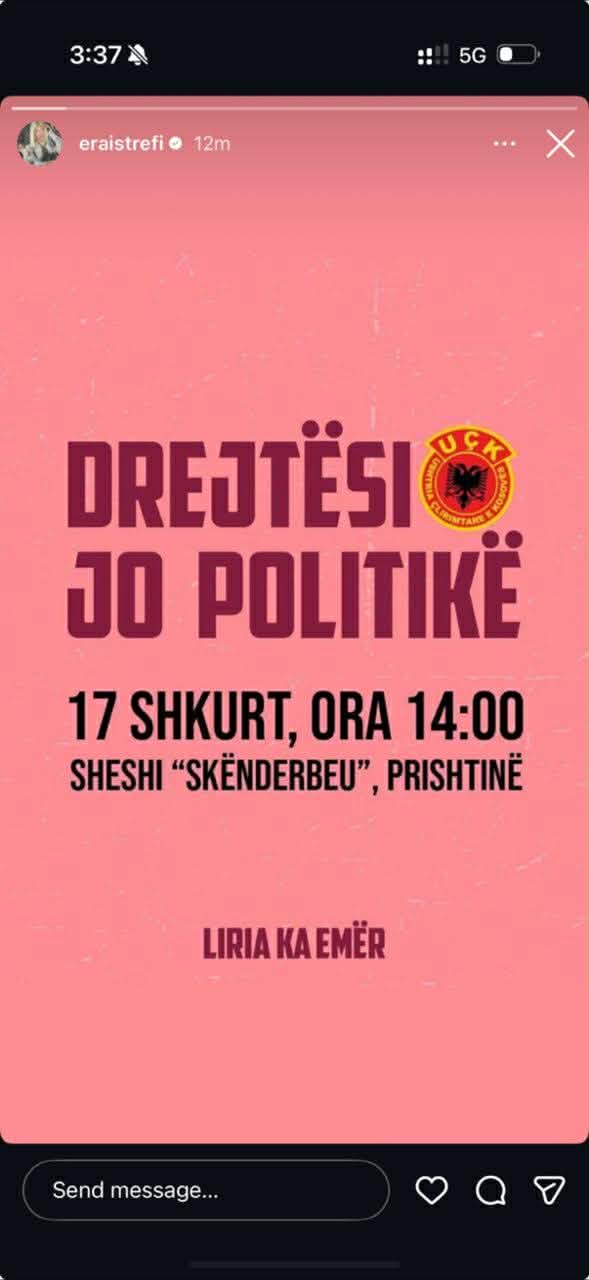 Këngëtarja e mirënjohur Era Istrefi ka shprehur mbështetjen e saj për Marshin “Drejtësi, jo politikë” që do të mbahet në Prishtinë më 17 shkurt dhe organizohet nga platforma “Liria ka Emër”, në në mbrojtje të drejtësisë së paanshme dhe ish-krerëve të UÇK-së që po gjykohen padrejtësisht në Hagë.