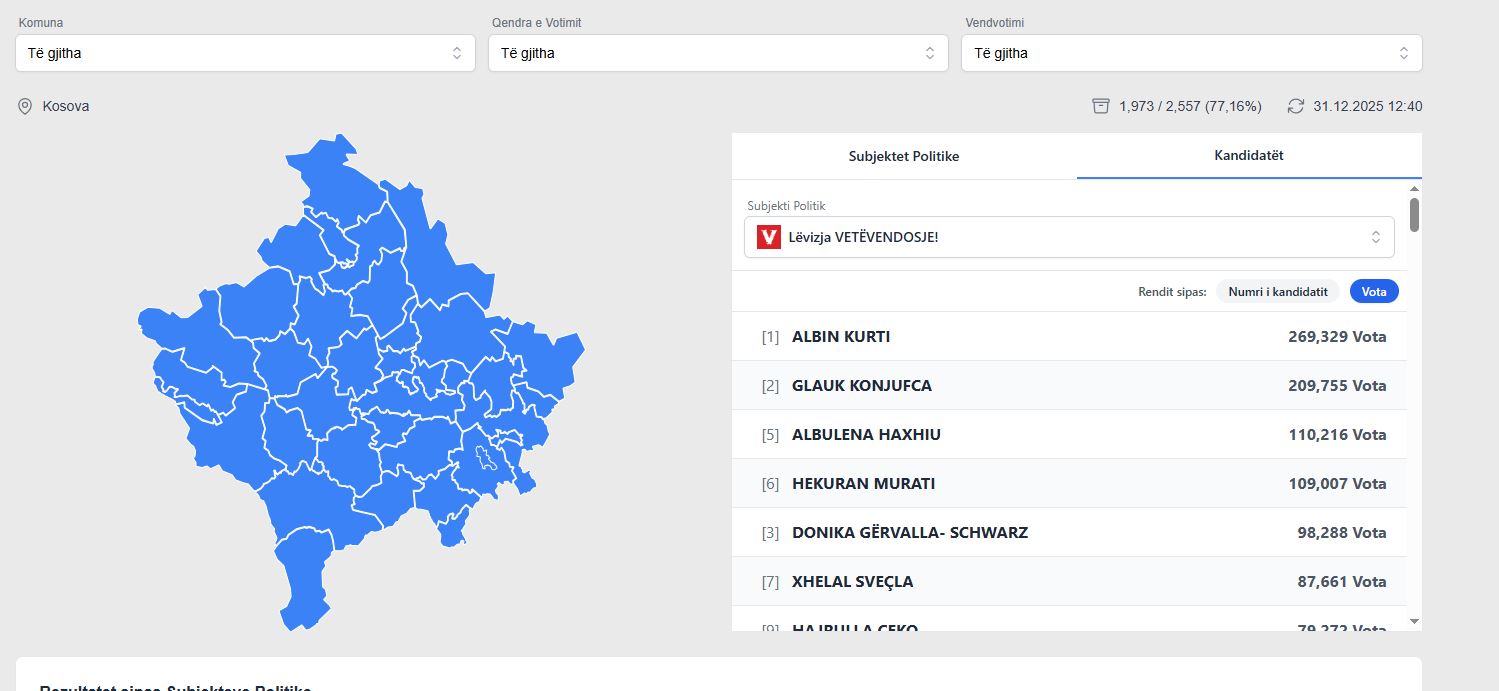 BallinaLajme Lajme Këta janë pesë kandidatët më të votuar të Vetëvendosjes 13:31 | 31/12/2025 FacebookWhatsAppViber By GAZETA SCANNER 0 68 - Advertisement - Nga rreth 80 për qind të votave të numëruara, tashmë po bëhet e qartë se kush do të jetë pjesë e Kuvendit të Republikës së Kosovës. Bazuar në të dhënat e përditësuara deri më tani, nuk ka fort ndryshime te Lëvizja Vetëvendosje. Te LVV, top 5-shja e parë janë Albin Kurti, Glauk Konjufca, Albulena Haxhiu, Hekuran Murati dhe Donika Gërvalla. Të ngjashme Lladrovci vlerëson Arian Tahirin: Kosova lë të jetë zemra jote! 14:58 | 31/12/2025 Lumir Abdixhiku jep dorëheqje zyrtarisht në Kuvendin e LDK-së 14:45 | 31/12/2025 Edona Llalloshi merr më shumë vota se shumë figura aktive të... 14:34 | 31/12/2025 Publikohet videoja /Vëllai dhe nipi i Halil Taçit të VV-së dyshohet... 13:44 | 31/12/2025 Astrologia e njohur parashikon ‘fatin’ e Kurtit për vitin e ardhshëm 13:17 | 31/12/2025 “Posta nuk ju ka dërguar këtë mesazh” – Policia paralajmëron qytetarët... 12:50 | 31/12/2025 Më shumë Artikulli paraprakMediet sociale përmirësojnë shëndetin e të moshuarveArtikulli tjetërModric flet për debatin “Messi vs Ronaldo” GAZETA SCANNER Të fundit Lajme Lladrovci vlerëson Arian Tahirin: Kosova lë të jetë zemra jote! Lajme Lumir Abdixhiku jep dorëheqje zyrtarisht në Kuvendin e LDK-së Lajme Edona Llalloshi merr më shumë vota se shumë figura aktive të VV-së Lajme Publikohet videoja /Vëllai dhe nipi i Halil Taçit të VV-së dyshohet se rrahen keq një person Lajme Astrologia e njohur parashikon ‘fatin’ e Kurtit për vitin e ardhshëm Lajme “Posta nuk ju ka dërguar këtë mesazh” – Policia paralajmëron qytetarët për SMS të rreme Më shumë