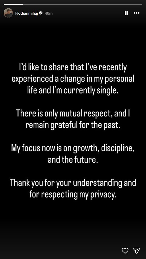 Në mesazhin e tij, Klodi theksoi se mes tij dhe ish-partneres ka mbetur vetëm respekt i ndërsjellë, duke shprehur edhe mirënjohje për të kaluarën që kanë ndarë së bashku.