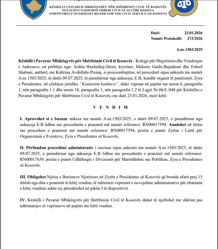 Sipas vendimit të datës 23 janar 2026, Këshilli i Pavarur Mbikëqyrës për Shërbimin Civil të Kosovës ka aprovuar si të bazuar ankesën e parashtruar nga kandidatja E.B., duke anuluar në tërësi procedurën e pranimit me numër reference RN00017594, për pozitën “Zyrtar i Lartë për Organizimin e Eventeve” në Zyrën e Presidentes së Kosovës.