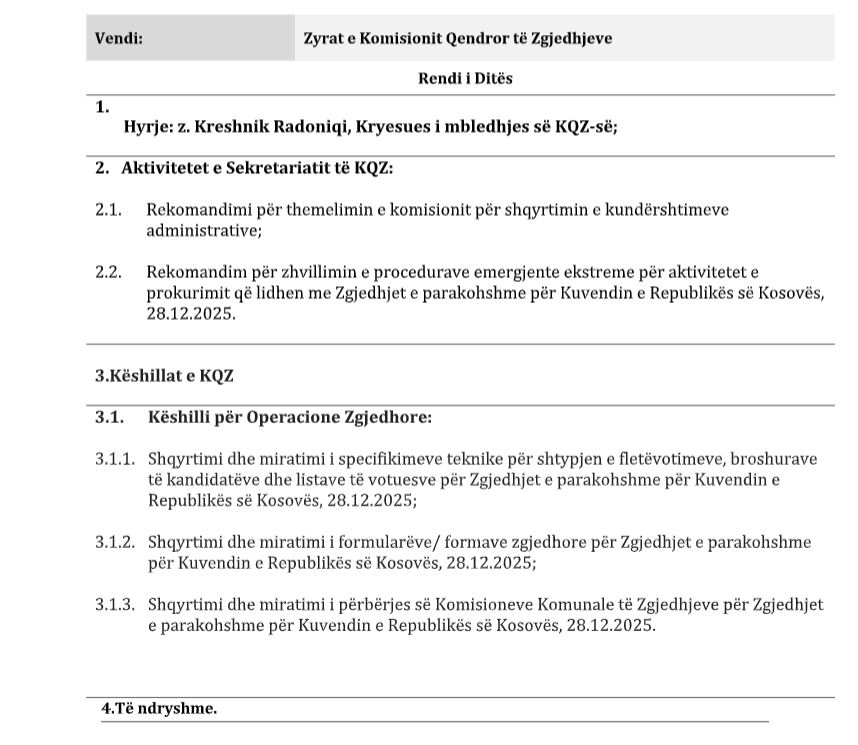 Në rend të ditës bëhet e ditur se bën pjesë edhe shqyrtimi dhe miratimi i formularëve/formave zgjedhore për zgjedhjet e parakohshme për Kuvendin e Republikës së Kosovës, si dhe shqyrtimi e miratimi i përbërjes së Komisioneve Komunale.