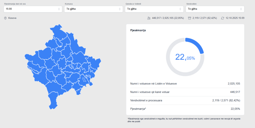 Deri në orën 15:00, 22.05 për qind e qytetarëve me të drejtë vote kanë votuar nëpër komunat përkatëse.