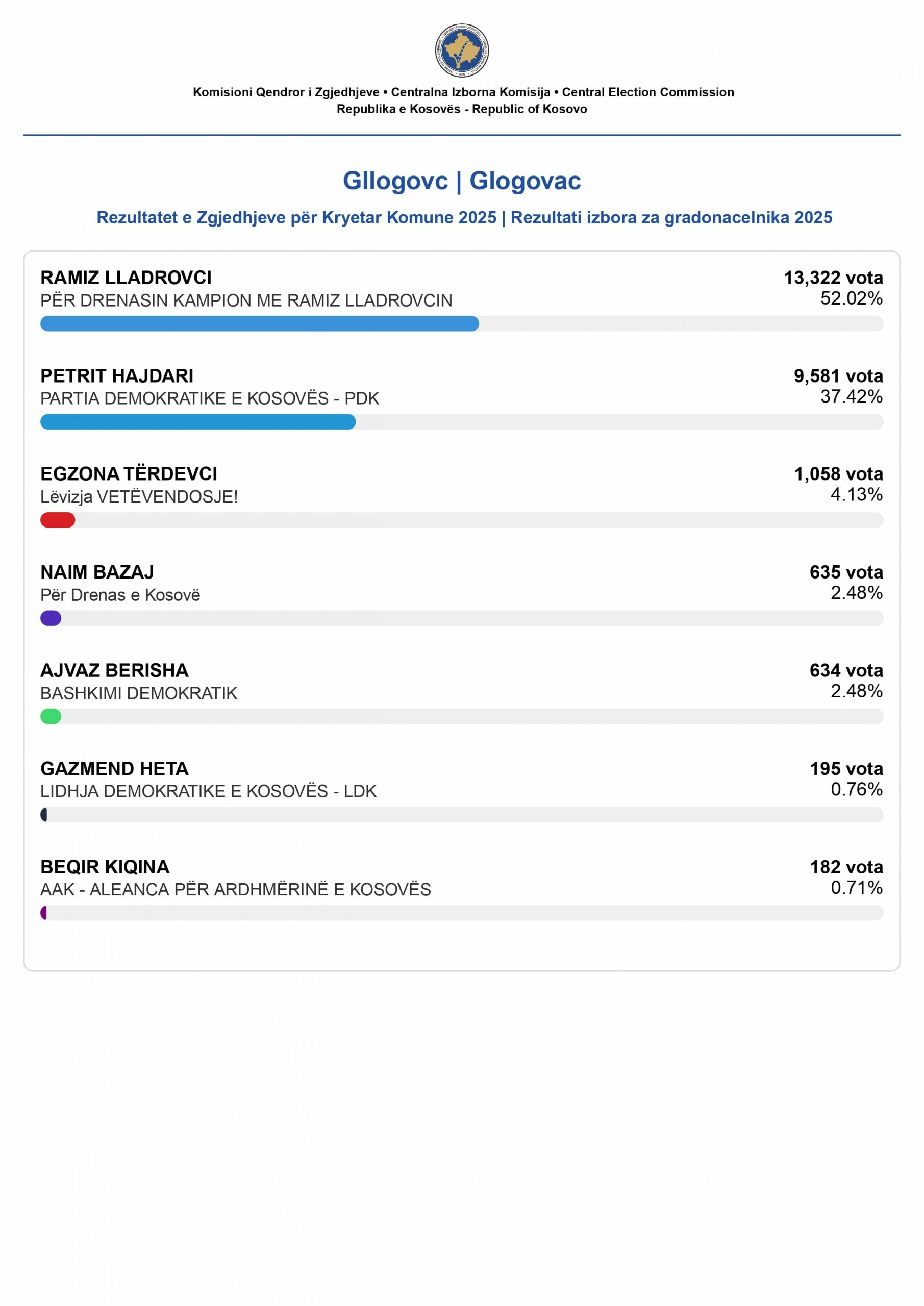 Me këtë rezultat, Ramiz Lladrovci siguron mandatin e tij të tretë në krye të Komunës së Drenasit, duke e konfirmuar besimin e qytetarëve dhe epitetin “Kryetar Kampion”.