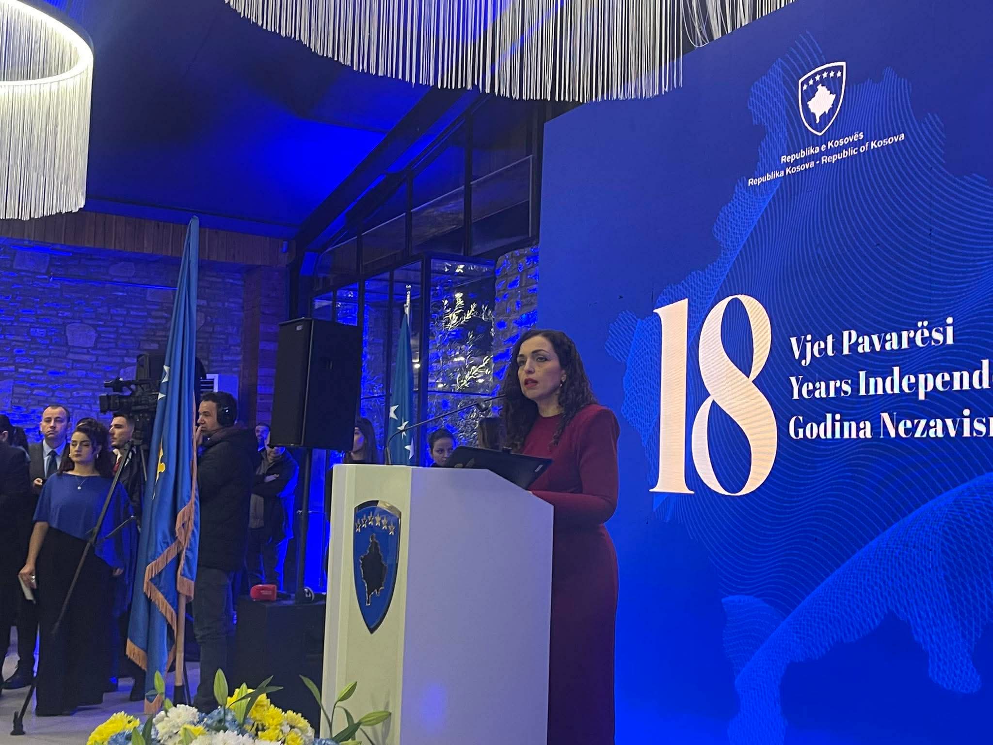 “Përulemi me respekt para vizionit të presidentit historik dhe arkitekti të pavarësisë Dr. Ibrahim Rugova. Përulemi me nderim para secilit dëshmor ushtar të UÇK-së dhe para secilit martir të lirisë, duke ditur se falë tyre jetojmë në një shtet të lirë, të pavarur dhe demokratik. Kontributi i tyre është përgjegjësisht i gdhendur në themelet e Republikës sonë. Në momentet më të errëta, kur dukej se shpresa ishte e largët, populli ynë nuk ishte i vetëm. Aleatët tanë qëndruan pranë neve dhe miqësia me ta mbetet një nga shtyllat më të fuqishme mbi cilat qëndron siguria dhe e ardhmja e Kosovës. Të nderuar qytetarë! Në këto tetëmbëdhjetë vite, Republika jonë ka kaluar sfida, por ka ecur përpara me vendosmëri, duke dëshmuar se rrënjët e saj janë të thella dhe se besimi i qytetarëve është forca më e madhe që ka ky shtet”, tha ajo.