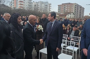 Kurti e Haradinaj përshëndeten gjatë një ceremonie në Klinë, pamje