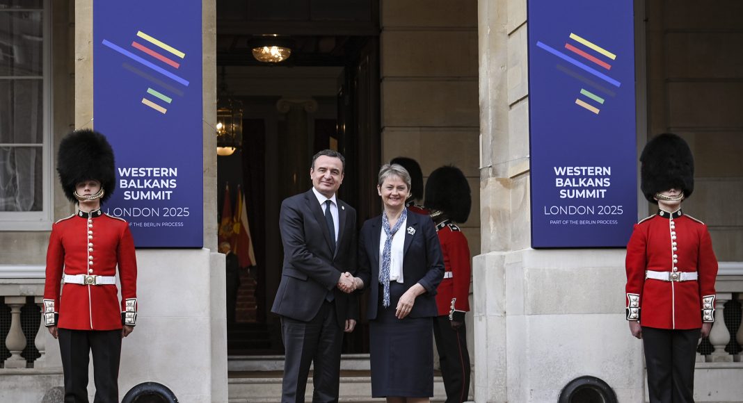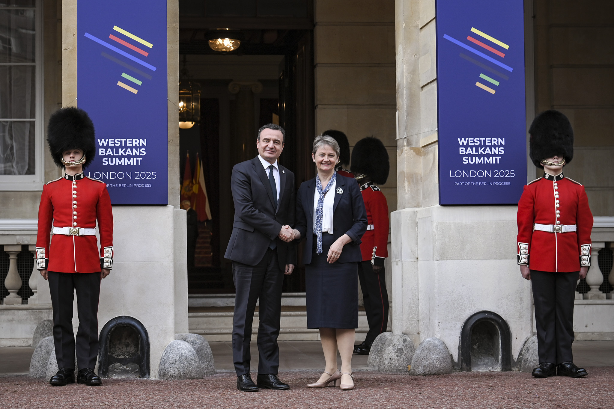 Kryeministri në detyrë i Republikës së Kosovës, Albin Kurti, mbërriti në Samitin e Procesit të Berlinit, i cili po mbahet në Londër, ku u prit para hyrjes në Samit nga Sekretarja e Shtetit për Punë të Jashtme të Mbretërisë së Bashkuar, Yvette Cooper.