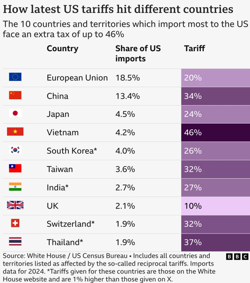 Këtu është një listë e tarifave totale me të cilat përballen disa vende: