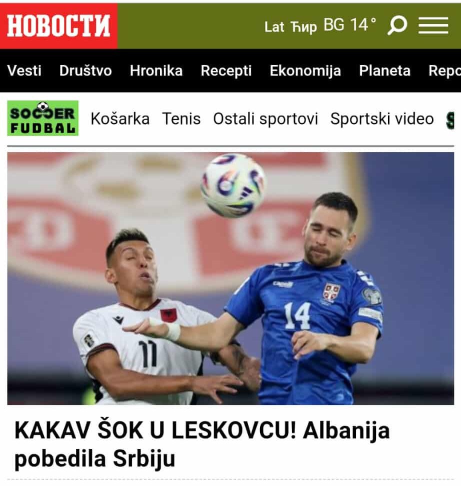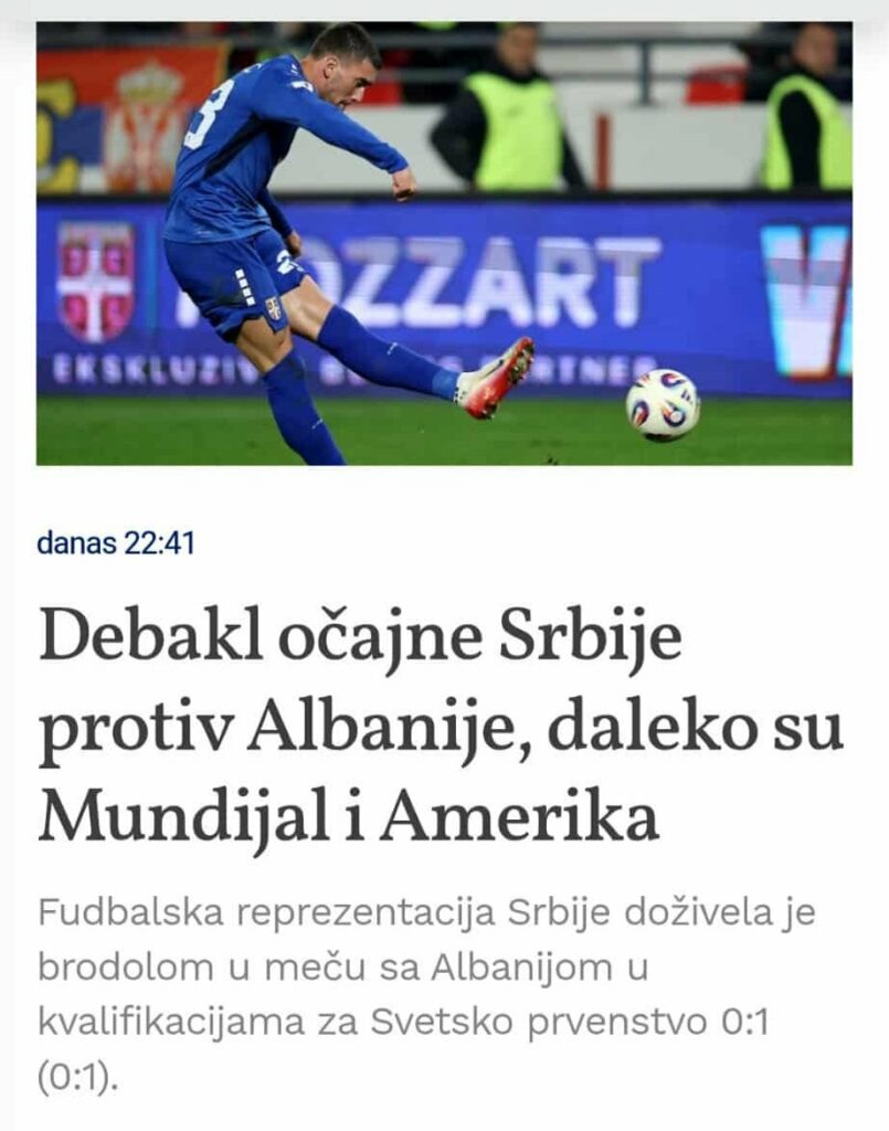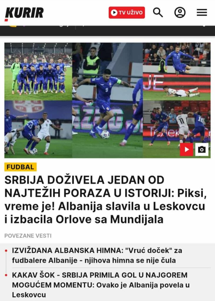 Fitorja e madhe e Kombëtares Shqiptare ndaj Serbisë ka bërë jehonë të madhe në mediat serbe, të cilat e kanë quajtur disfatën ndaj kuqezinjve si “humbjen më të rëndë në histori”.