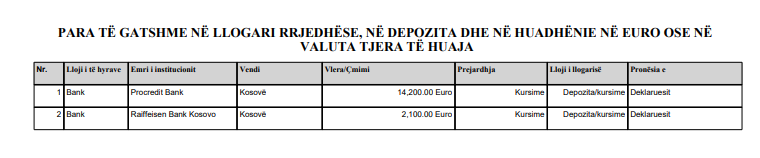 Po ashtu, Murati është edhe në posedim të Letrave me Vlerë, të cilat janë në vlerë nga rreth 2 mijë euro, deri në vlerë rreth 39 mijë euro.