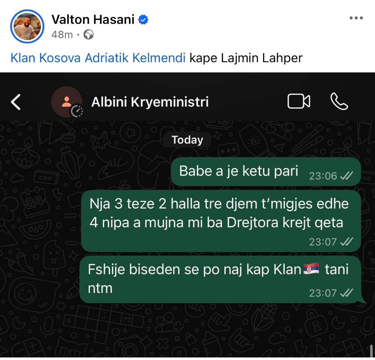 Përveç kësaj, Hasani, i cili në profilin e tij shfaqet si admirues dhe i fiksuar pas kryeministrit në detyrë, Albin Kurti, ka përdorur termin “Klan Serbia” në disa mesazhe që dukeshin të drejtuara ndaj udhëheqësit të Lëvizjes Vetëvendosje, të cilit i referohet si “babë”.