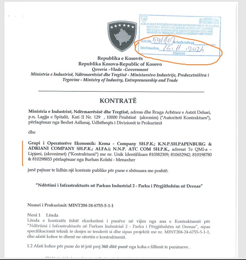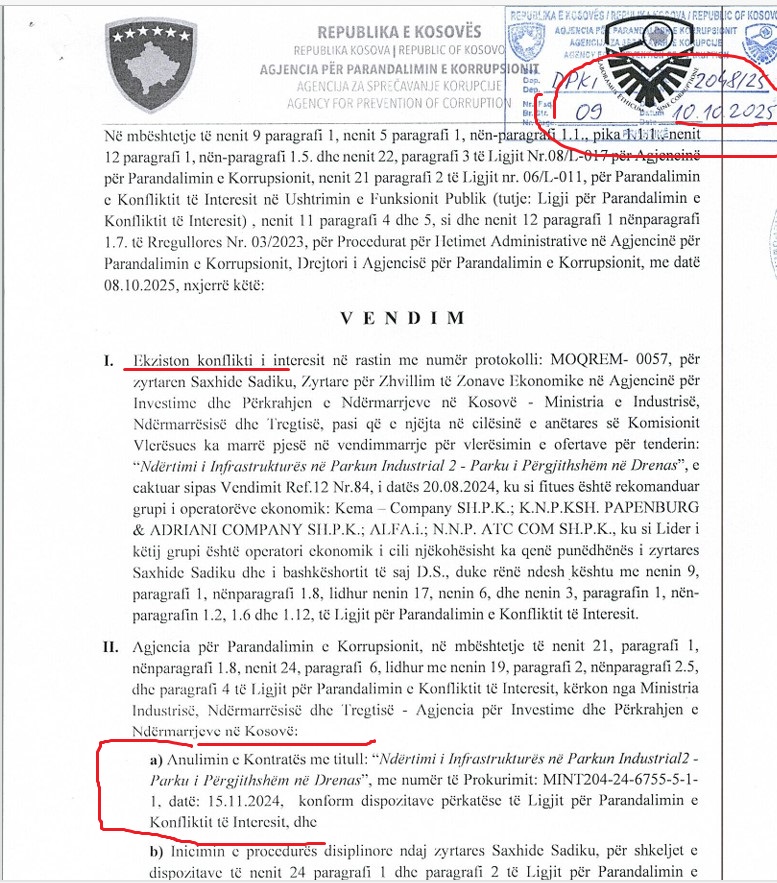 Bëhet fjalë për tenderin “Ndërtimi i Infrastrukturës në Parkun Industrial 2 – Parku i Përgjithshëm në Drenas”, i hapur që në korrik të vitit 2024, për të cilin Agjencia ka zhvilluar një procedurë të plotë administrative dhe ka nxjerrë vendim përfundimtar, duke konstatuar se procesi i prokurimit është zhvilluar në kundërshtim me ligjin për parandalimin e konfliktit të interesit